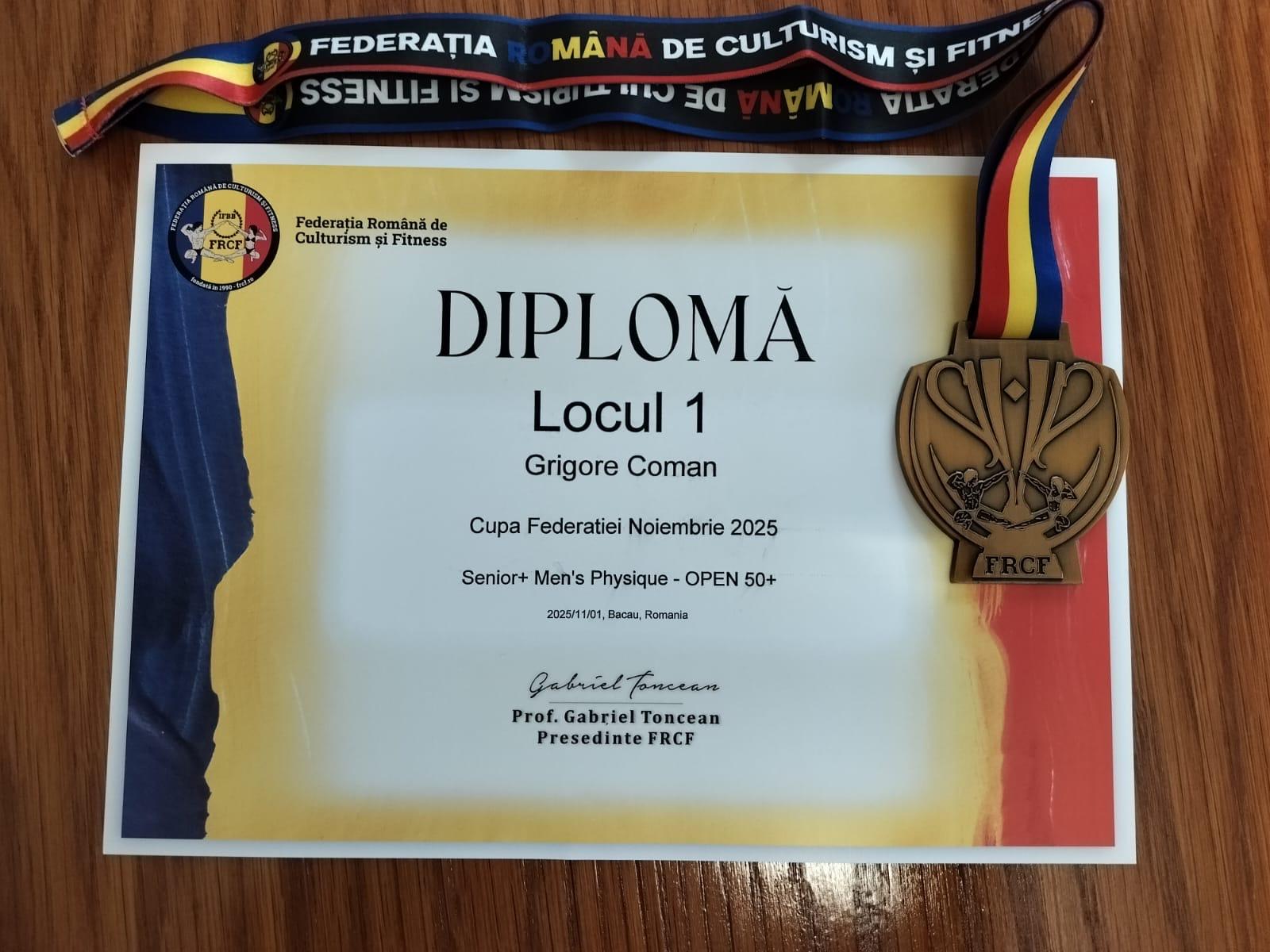 Distincția i-a fost acordată la categoria Senior+ Men’s Physique – OPEN 50+, confirmând nu doar o formă fizică excelentă, ci și o pasiune constantă pentru sport și performanță. Diploma de „Locul 1”, semnată de președintele Federației Române de Culturism și Fitness, prof. Gabriel Toncean, atestă reușita remarcabilă a profesorului maramureșean.