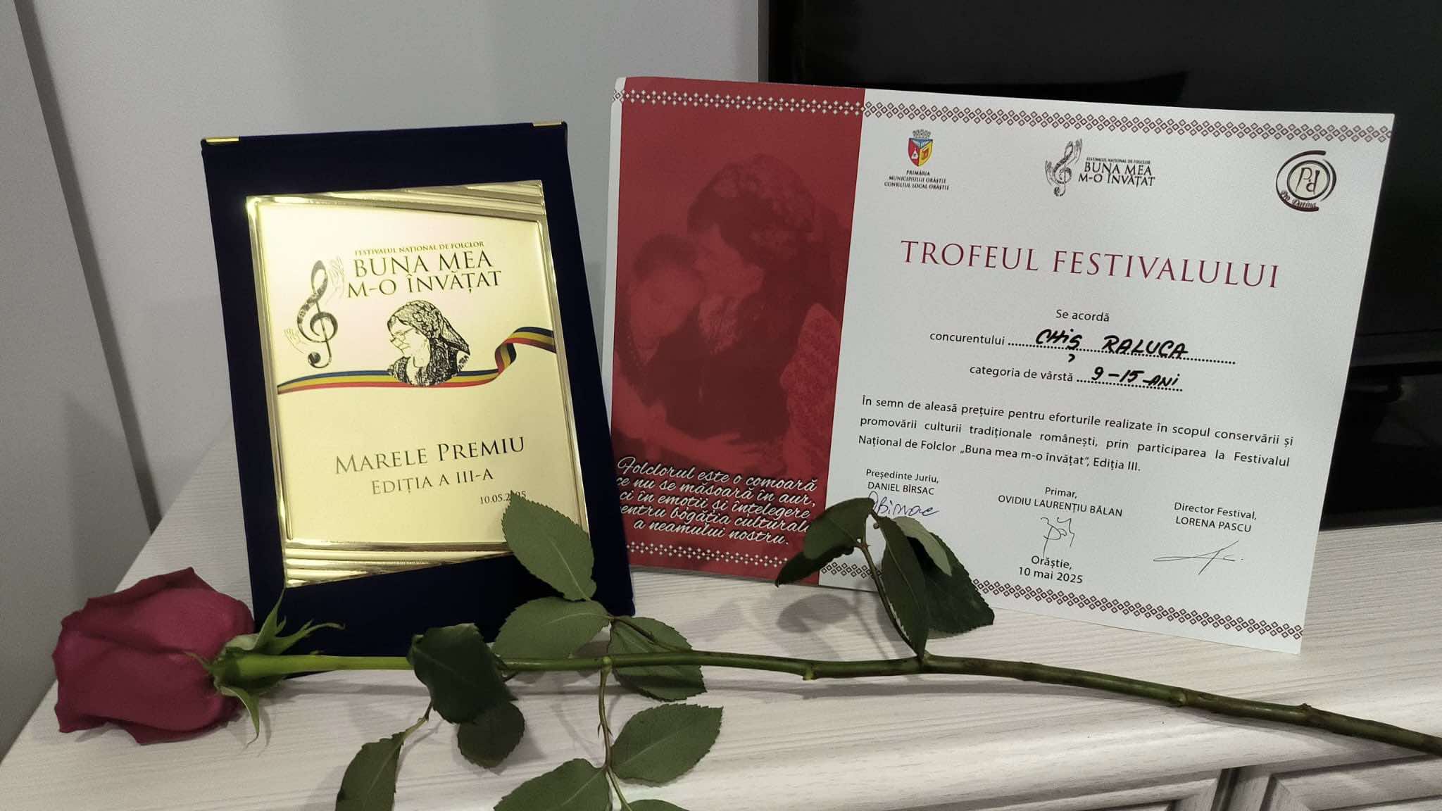 „Suntem încântați să anunțăm un rezultat de excepție obținut la Festivalul Național de Folclor „Buna mea m-o învățat”, desfășurat la Orăștie (10 mai 2025). În cadrul acestui eveniment de prestigiu, la care au participat peste 50 de concurenți din întreaga țară, eleva Raluca Izabela Chiș, de la Școala de Artă „Gheorghe Chivu” (Clasa canto muzică populară) din cadrul Centrului Cultural Sighet, sub îndrumarea profesorului Marius Iusco, a reușit să cucerească juriul și publicul, câștigând Trofeul Festivalului și Marele Premiu.