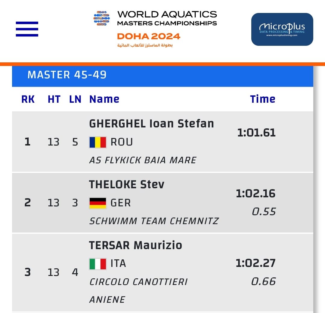Medalia de argint a revenit colosului (2.02cm) Stev Theloke, Germania, multiplu medaliat mondial, european și olimpic al probei cu timpul 1:02.16. Locul 3 a revenit ca și la ediția precedentă Kyushu 2023 italianului Tersar Maurizio 1:02.27 Felicitări!”, anunță Cristian Gherghel, fratele campionului.
