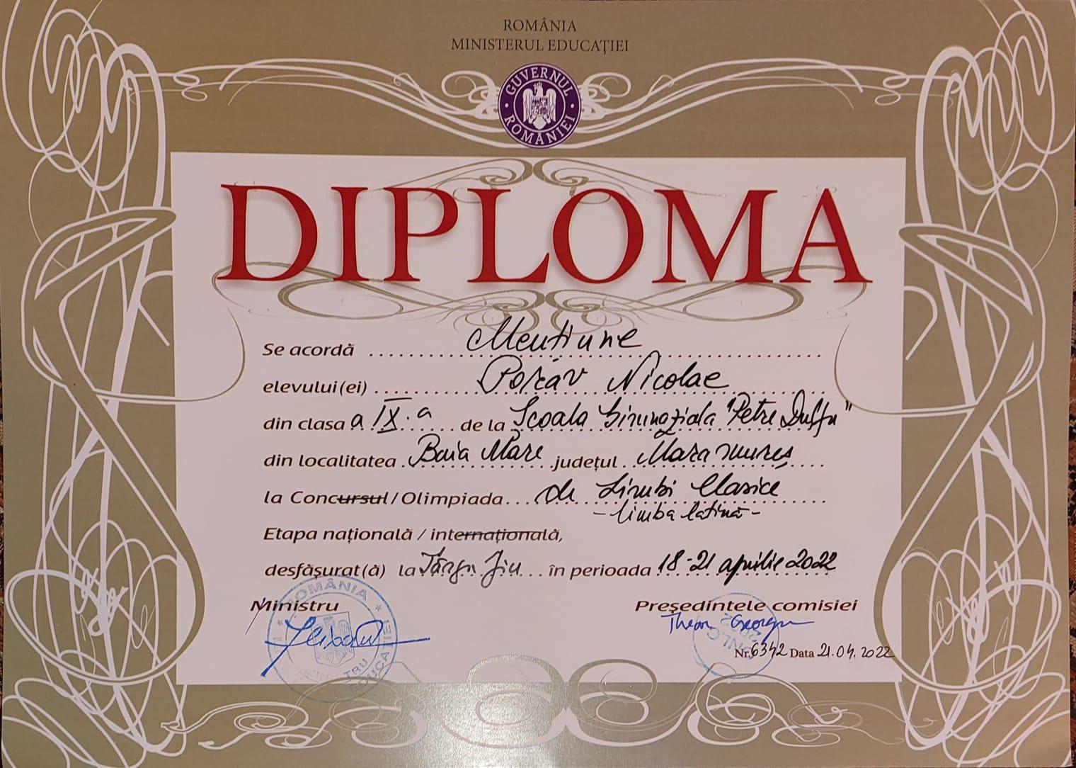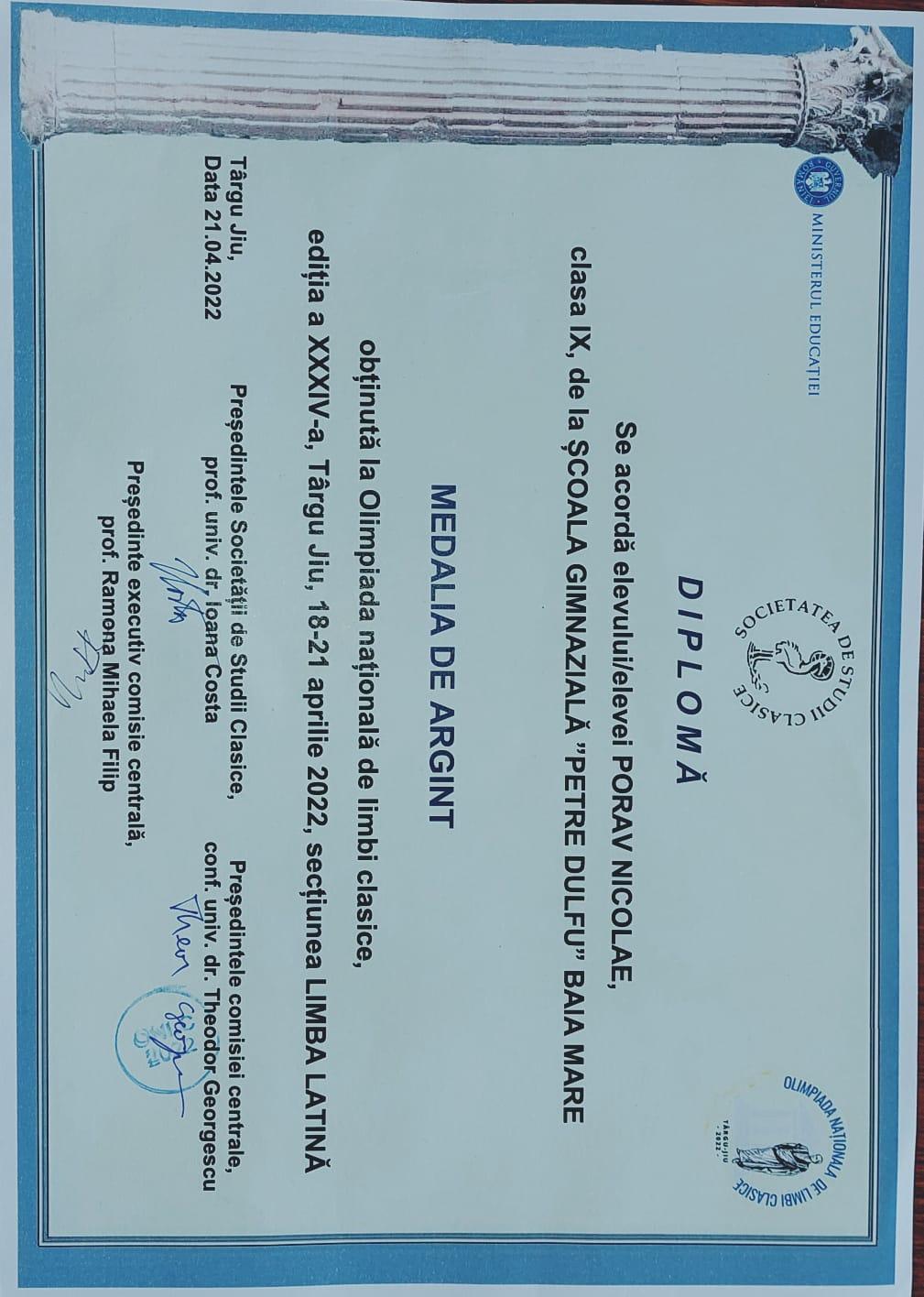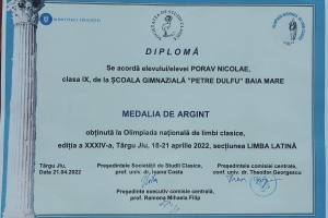 Un elev de la Școala Gimnazială „Petre Dulfu” Baia Mare a obținut mențiune și medalie de argint la Olimpiada de Limbi Clasice – Limba Latină