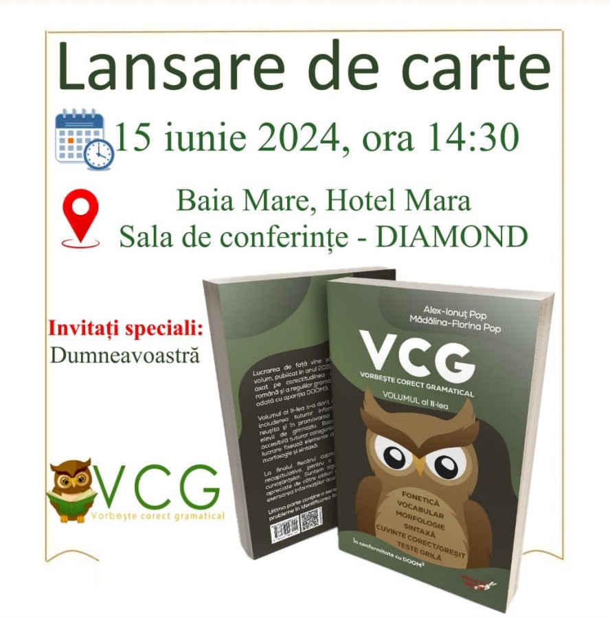 Așadar, în data de 15 iunie, ora 14:30, la Hotel Mara, Baia Mare, în sala de conferințe DIAMOND, vă așteptăm pe cei care simțiți să ne fiți alături la evenimentul lansării de carte. VCG — Vorbește corect gramatical, volumul al II-lea, s-a dorit a fi unul complex prin includerea tuturor informațiilor necesare în reușita și în promovarea examenului de Evaluare Națională și nu numai.