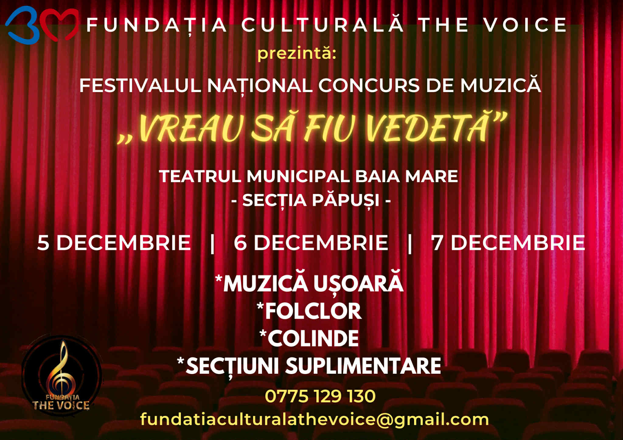 În perioada 5-7 decembrie, la Teatrul de Păpuși din Baia Mare va avea loc ediția de iarnă a Festivalului Național Concurs de Muzică „Vreau să fiu Vedetă”, organizat de Fundația Culturală The Voice.
