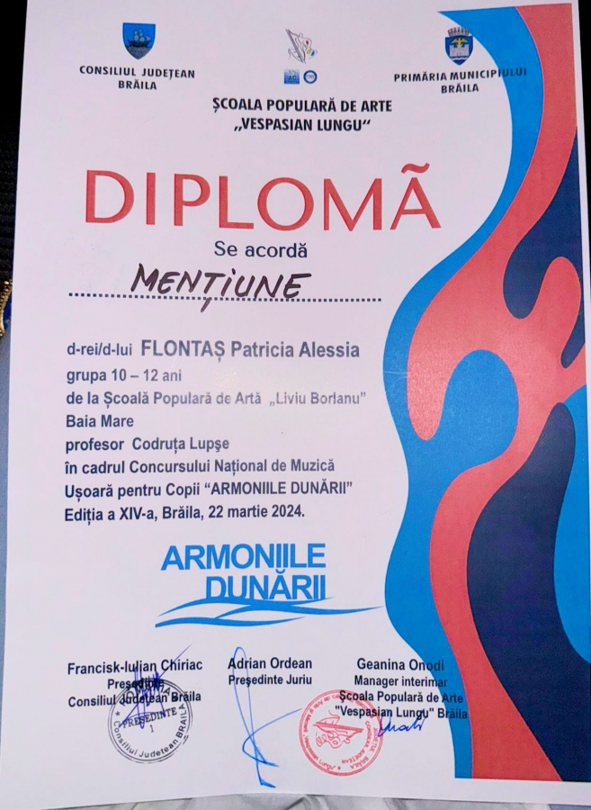 Talent: Patricia Flontaș de la Școala Populară de Artă din Baia Mare a fost premiată în cadrul Concursului Național de Muzică Ușoară pentru Copii „Armoniile Dunării”
