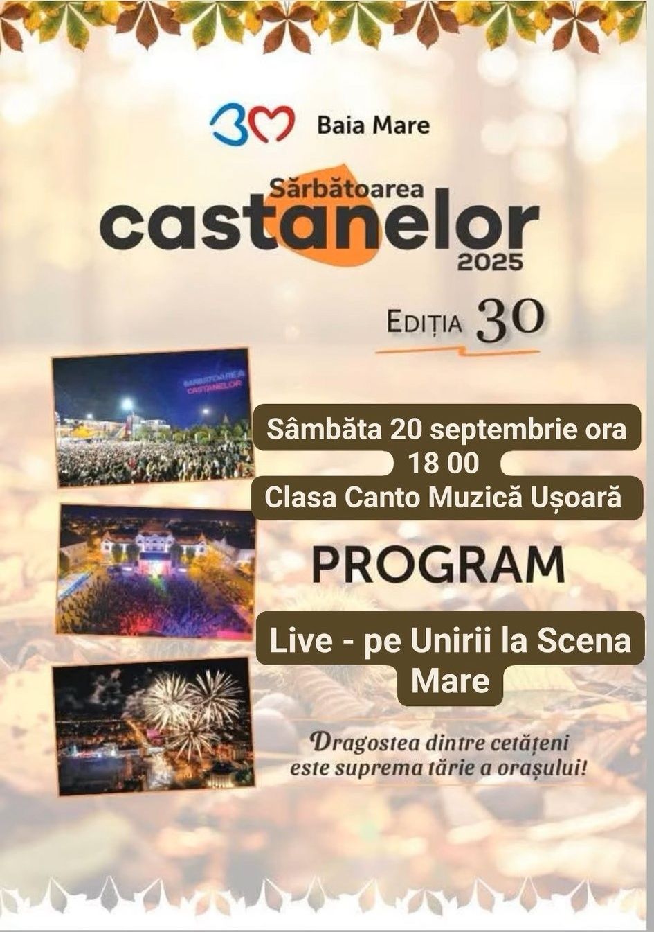 Sâmbătă, 20 septembrie, de la ora 18.00, cursanții Clasei Canto Muzică Ușoară din cadrul Școlii Populare de Artă – pregătiți de prof. Codruța Lupșe – vor evolua pe scena mare (de pe bd. Unirii) din cadrul Sărbătorii Castanelor.