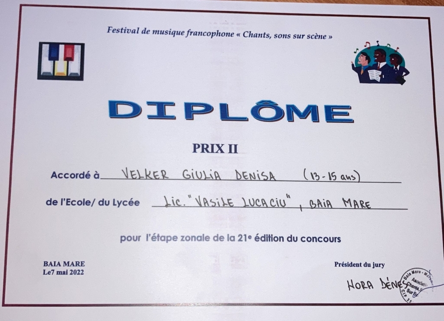 Lucacista Giulia Velker a obținul premiul II la Festivalul de muzică francofonă „Chants, sons sur scène” și s-a calificat la națională