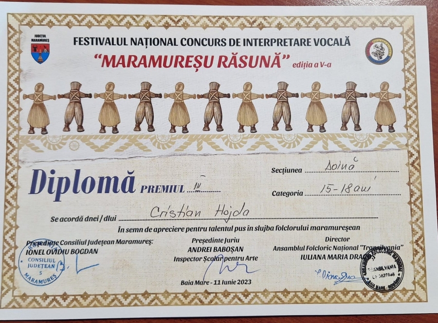 - Locul III Concursul Național „Maramureșul Răsună” – secțiunea Doină;