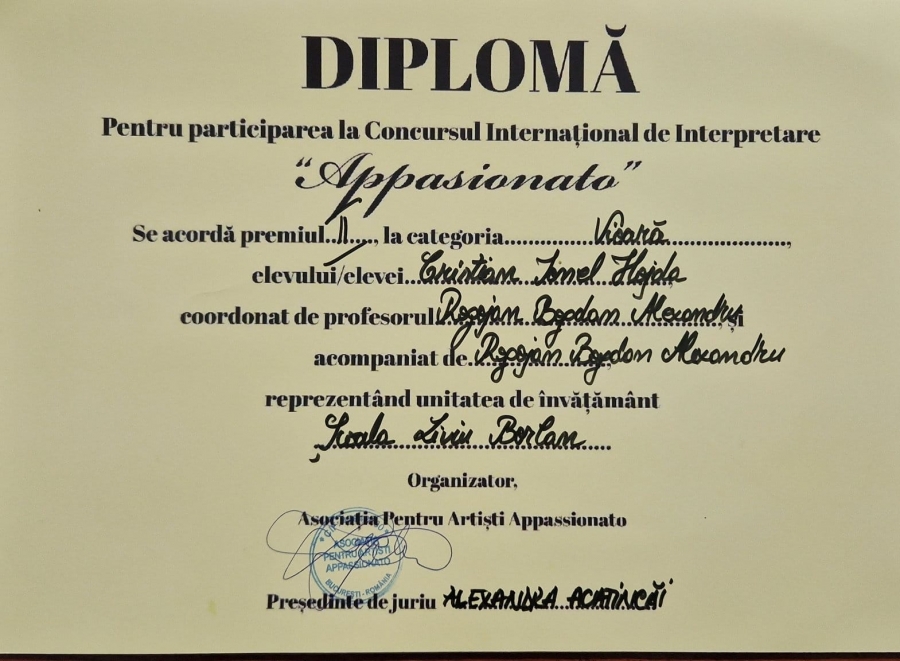 - Locul II la Concursul Internațional de Interpretare „Appasionata”;
