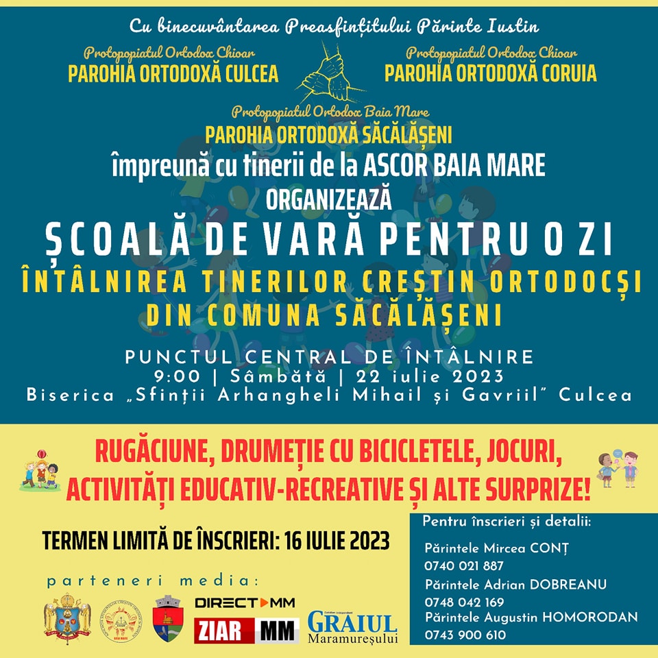 Cu binecuvântarea Preasfințitului Părinte Iustin, cele trei parohii ortodoxe aparținătoare comunei Săcălășeni – Culcea, Coruia și Săcălășeni – organizează sâmbătă, 22 iulie, de la ora 9:00, Școala de vară pentru o zi intitulată „Întâlnirea tinerilor creștini ortodocși din comuna Săcălășeni”.