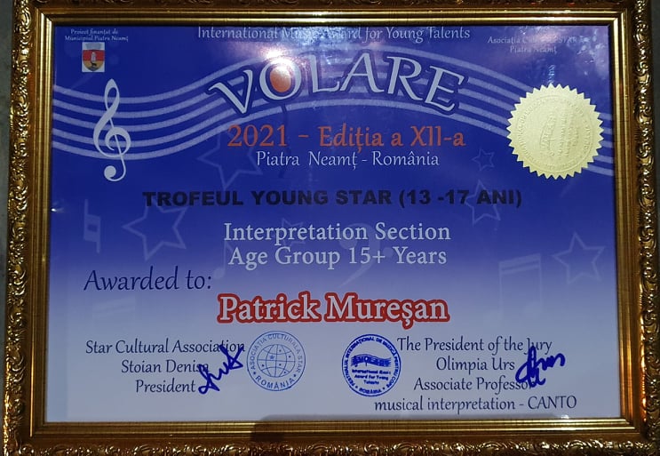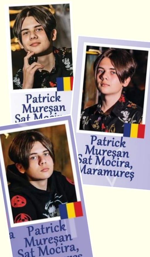 „Numele meu este Patrick Mureșan, am 15 ani, sunt elev la Colegiul de Arte din Baia Mare, clasa a IX-a, secțiunea canto clasic. Fac canto de la 8 ani, am moștenit talentul de la bunicii materni, care au fost cântăreți de muzică populară la Ansamblul Maramureș. În cei 8 ani am participat la multe concursuri atât în țară, cât și în străinătate, unde am obținut atât mențiuni, cât si premii 1, 2,3, dar și trofee.
